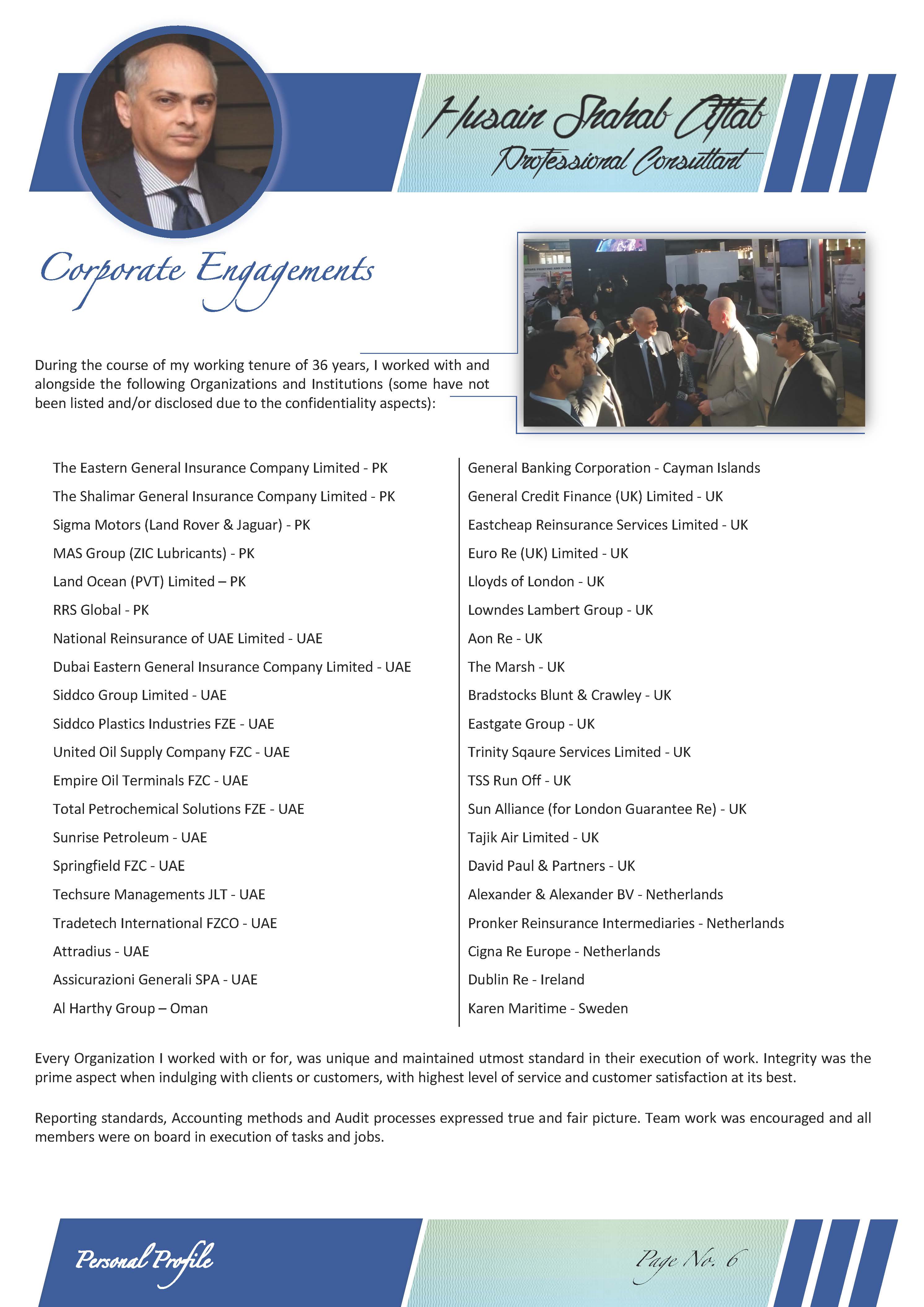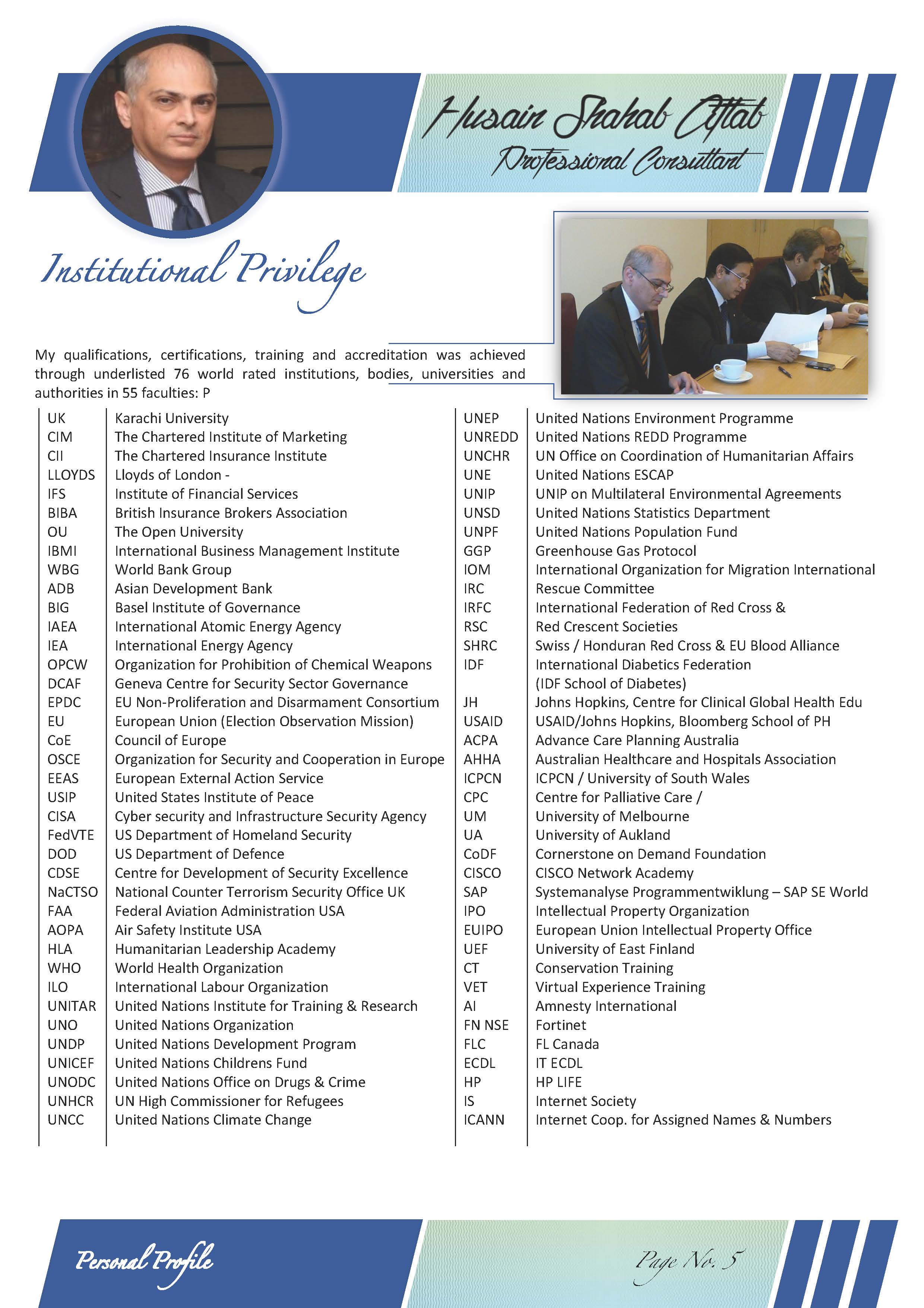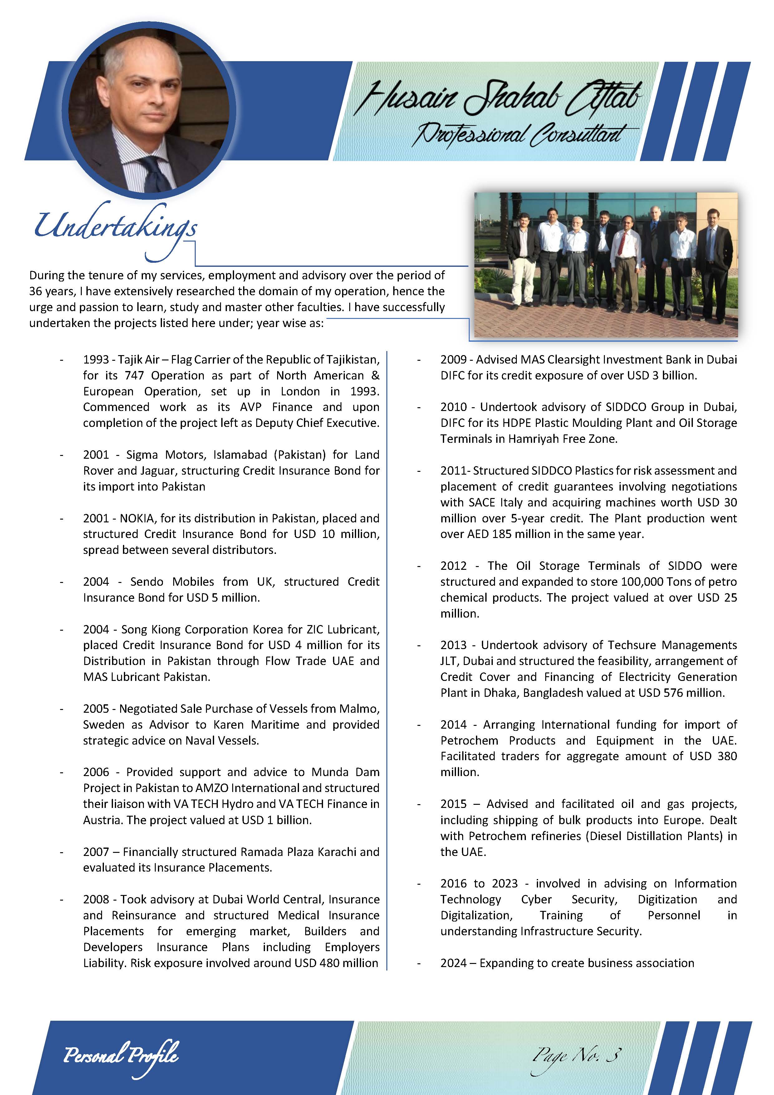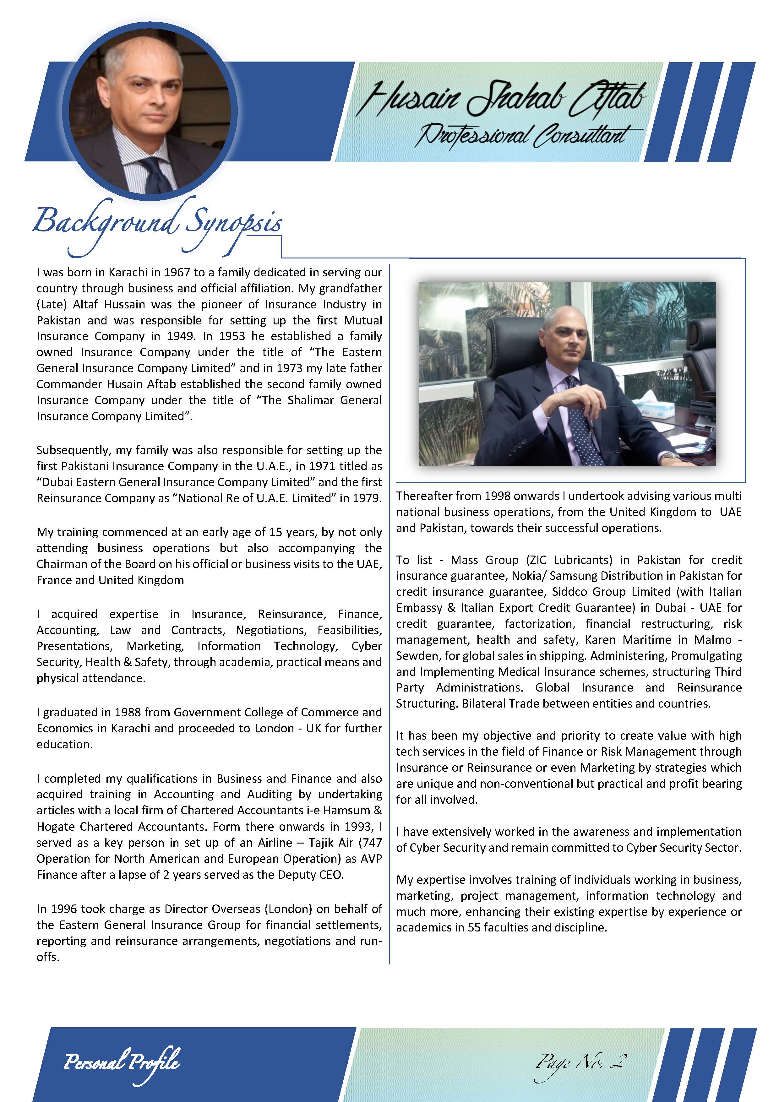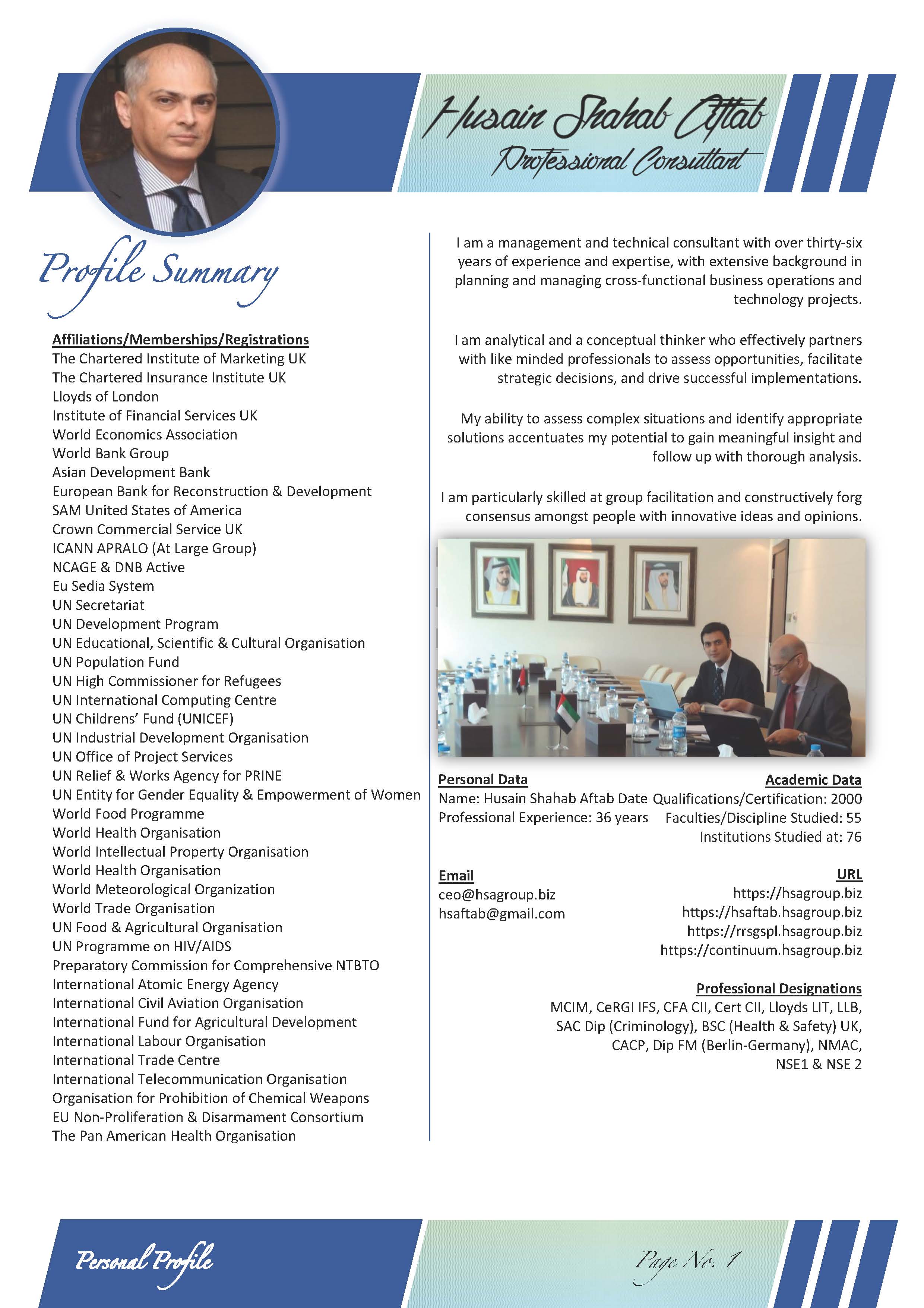 Mr. Aftab is an expert in managing and advising on Cross Border Bilateral Business set up, Feasibilities, Business Planning and Strategies, Business Operations and Management, Insurance and Reinsurance, Information Technology, Digitization and Digitalization, Environment and Climate Control and Business Intelligence globally. He is constructively associated, affiliated and connected to numerous Academic Institutions, Bodies, Agencies and Organizations, from where he draws his knowledge, vision and perception to strengthen his expertise, hence forth his vast experience.